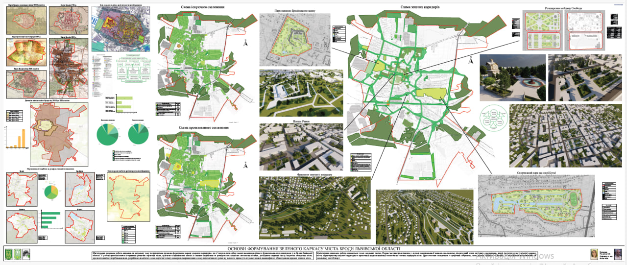 Магістерська дипломна робота виконана на актуальну тему та присвячена питанню формування мережі «зелених коридорів», що з’єднують між собою зелені насадження різного функціонального призначення у м. Броди Львівської області. У роботі проаналізовано історичний розвиток території міста, здійснено порівняльний аналіз із іншими подібними за розміром так кількістю населення містами, досліджено видовий склад існуючих насаджень міста, проаналізовані категорії насадження, розроблено аналітичні схеми існуючого стану екомережі, запропоновано схему перспективного розвитку зеленого каркасу та візуальні моделі ландшафтного облаштування окремих ділянок міста.