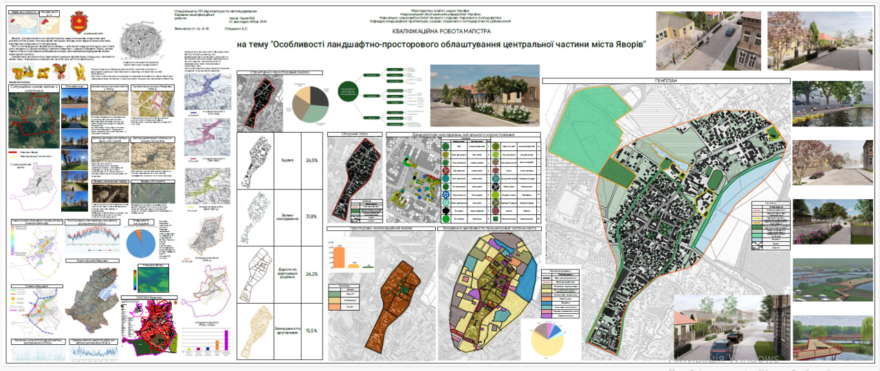 У магістерській кваліфікаційній роботі досліджено принципи ландшафтно-просторового облаштування центральних частин малих міст на прикладі міста Яворів. Проаналізовано сучасний стан ландшафтної організації центральної території, зокрема функціональне зонування, рівень озеленення, наявність громадських просторів та їхній зв'язок із архітектурними елементами міста.